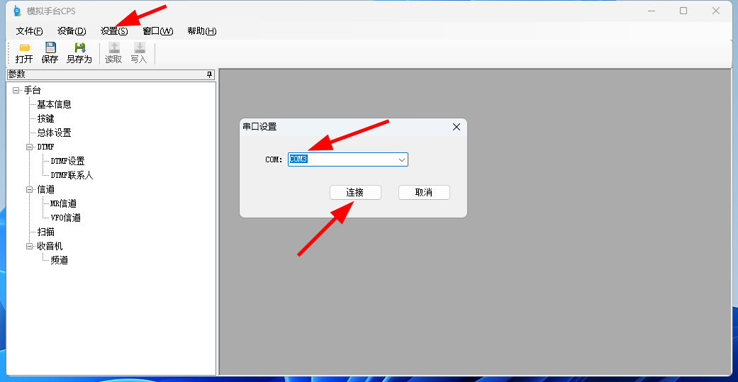 设置好对应端口之后,就可以“读取”(联机)一下现有对讲机中的数据。(这个方法也可以从侧面来验证 电脑-数据线-对讲机 之间的通讯是否正常连接)