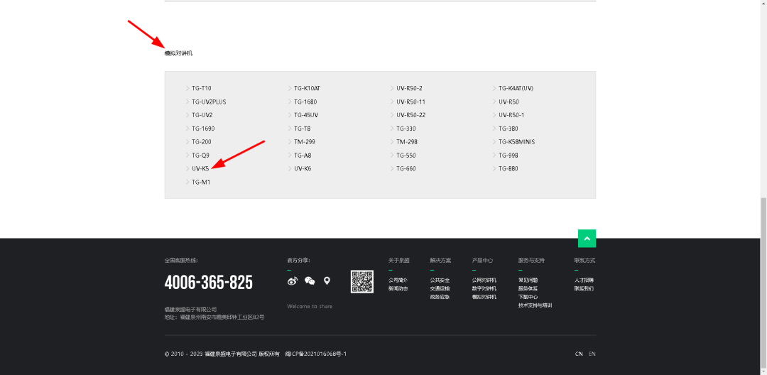 泉盛电子官网(www.qsfj.com)提供了丰富的对讲机技术支持,我们可以登陆官网右上角的服务与支持—下载中心,进入相关的型号界面。