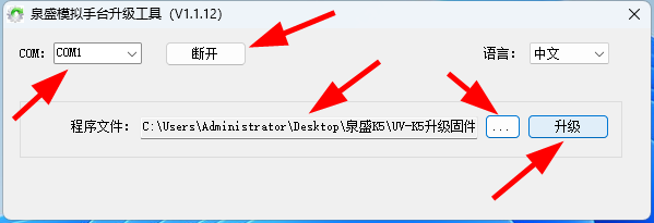 当正确通过数据线连接对讲机之后,固件刷新软件,端口设置旁边的“连接”就会变成:断开,这就意味着,PC端与对讲机已经正确连接,可以进行固件刷新操作了。