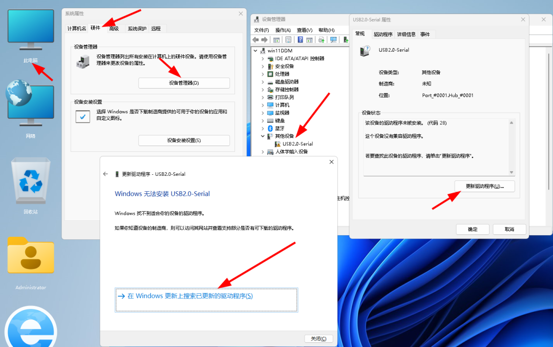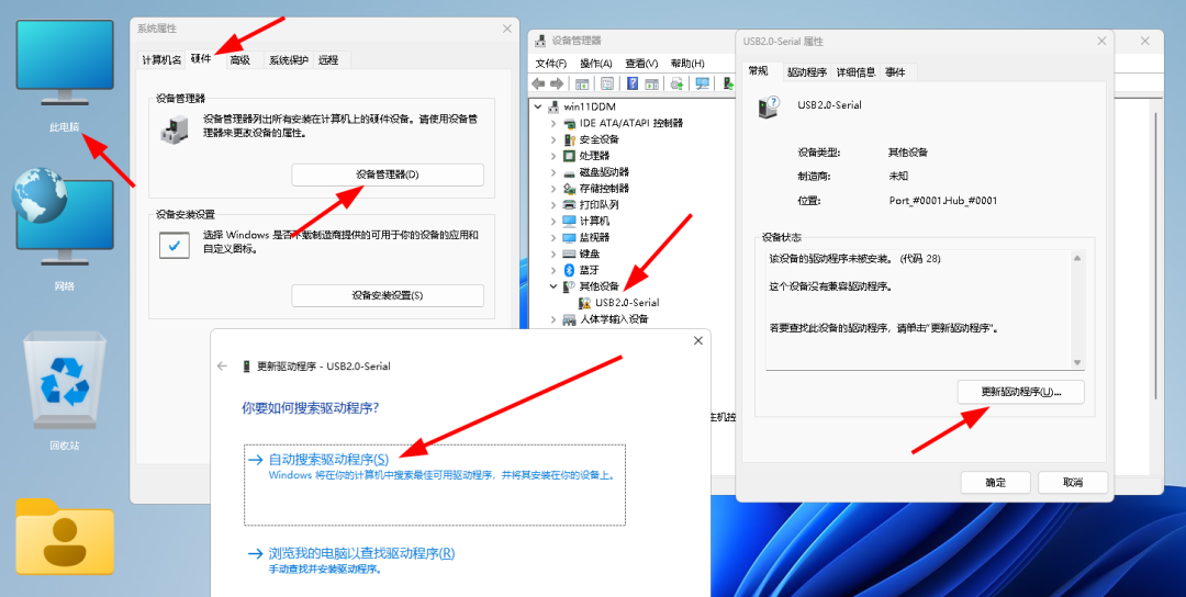 新接入的“硬件”需要正确安装“驱动程序”之后才能进行正常的通信操作。我们可以先尝试着:自动搜索驱动程序,或者 在WINDOWS更新上搜索已更新的驱动程序,进行尝试安装。
