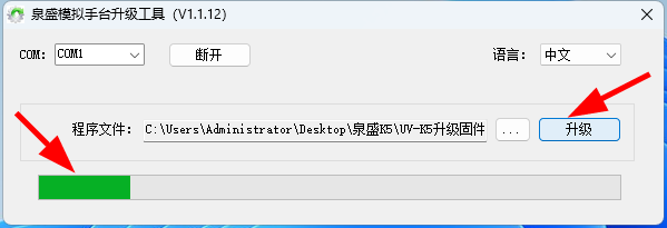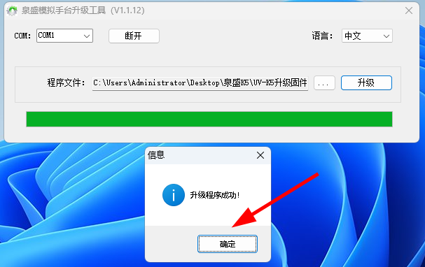 当正确选择相应的“程序文件”(需要写入对讲机的固件之后),就可以进行固件的刷新操作了。