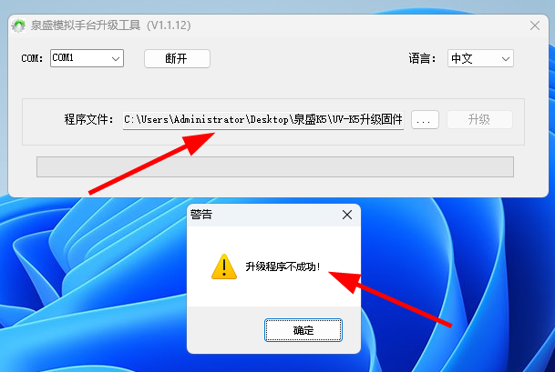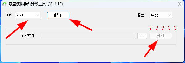 还需要注意的是:当对讲机与PC端连接不正常时,“升级”按键会变成“灰色”,这时我们需要点击“断开”,重新检查数据线或者对讲机是否已经进入“固件刷新模式”从而再次进行“连接”。