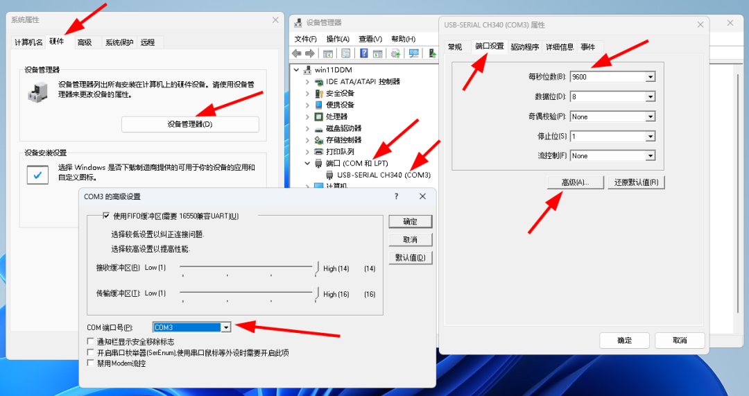 虽然这条数据线已经是USB接口了,但是实际内在的芯片通信协议还是9针串口为原型。所以我们可以通过已经正确安装驱动程序之后在“端口(COM和LPT)”选项中,查看到相应的USB-Serial CH340(COM3)中看出这一点。