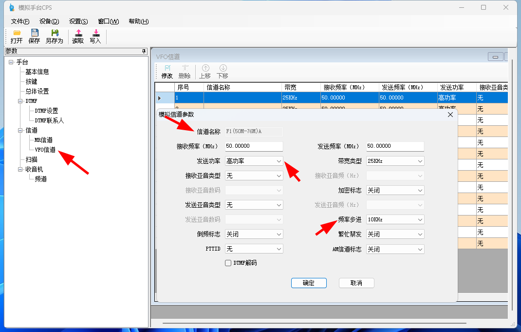 “VFO信道”:对一些常用V段频率进行信道(名称)的标识命名及相应具体要求的设置,如:通信时发射功率的高低等。
