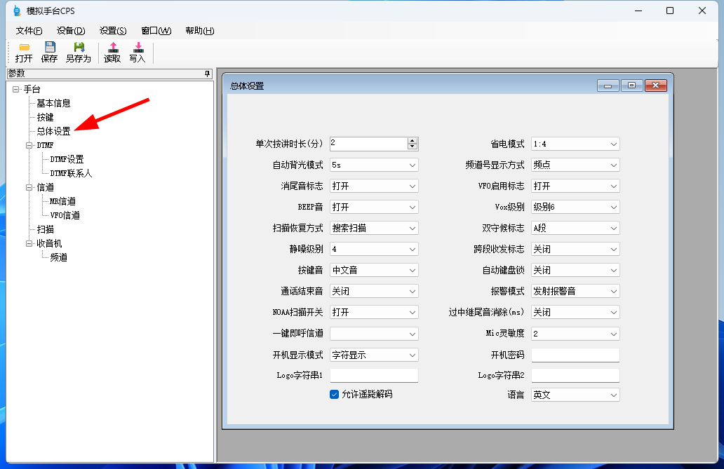 “总体设置”:用户根据自身的应用需要,将对讲机在实际使用中的一些功能细节进行相应的设置。