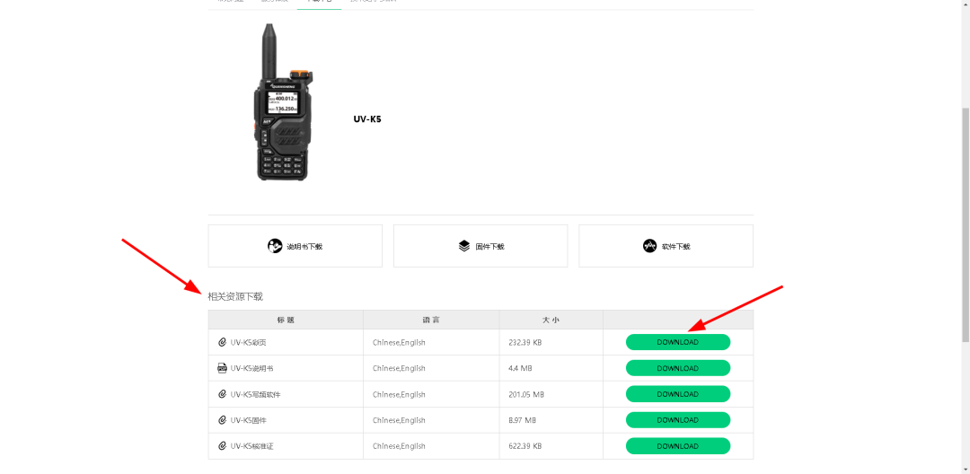 在“相关资源下载”区域,可以看到写频软件、固件、说明书、彩页、核准证等相关压缩包,可以说是“一网打尽”。