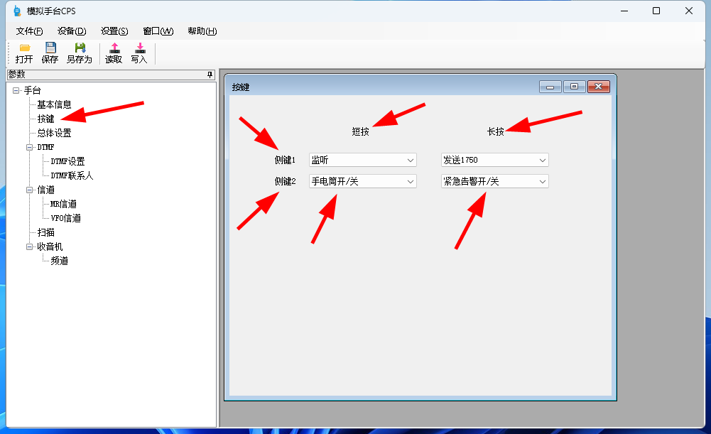 对讲机的左侧设计有两个按键,用户可以通过写频软件中的“按键”选项,根据自身的实际需要,对这两个侧键进行相应的定义。